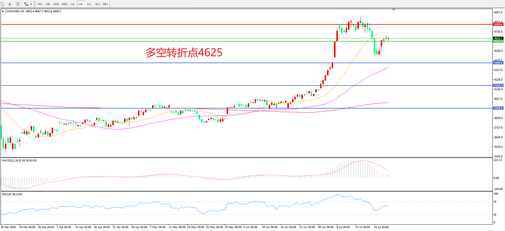 4小时图看,沪深300高开高走,整体表现强势,均线系统逐渐发散,4625成为短期多空分水岭, MACD红柱增加,RSI指标向上,日内延续震荡概率较大。