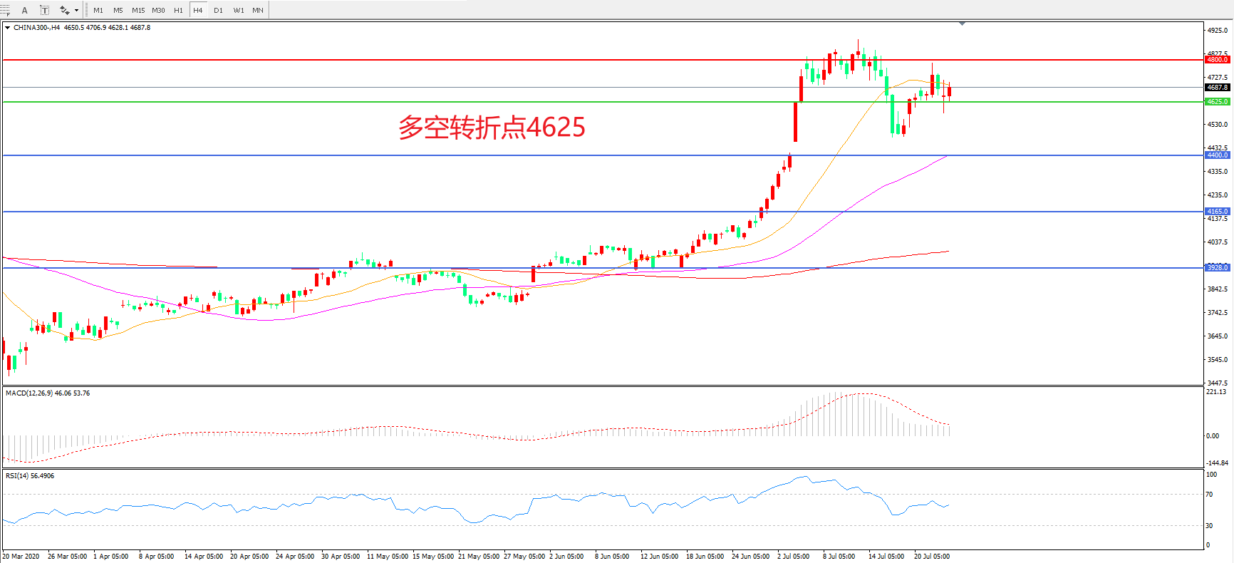 4小时图看,沪深300呈现宽幅震荡走势,整体呈现高位震荡走势,4625成为短期支撑,均线系统逐渐走平,MACD红柱增加,RSI指标向上,日内延续震荡概率较大。