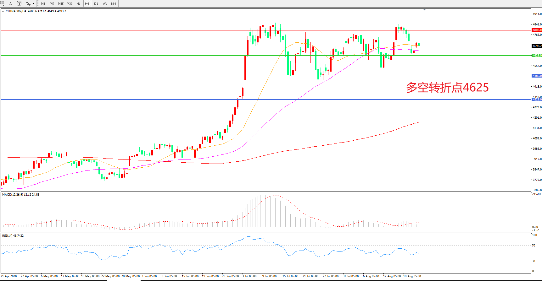 4小时图看,沪深300延续低位震荡,整体表现相对低迷,4625成为短期支撑,4800成为上方阻力,均线系统走平, MACD红柱缩短,RSI指标向上,日内延续震荡概率较大。