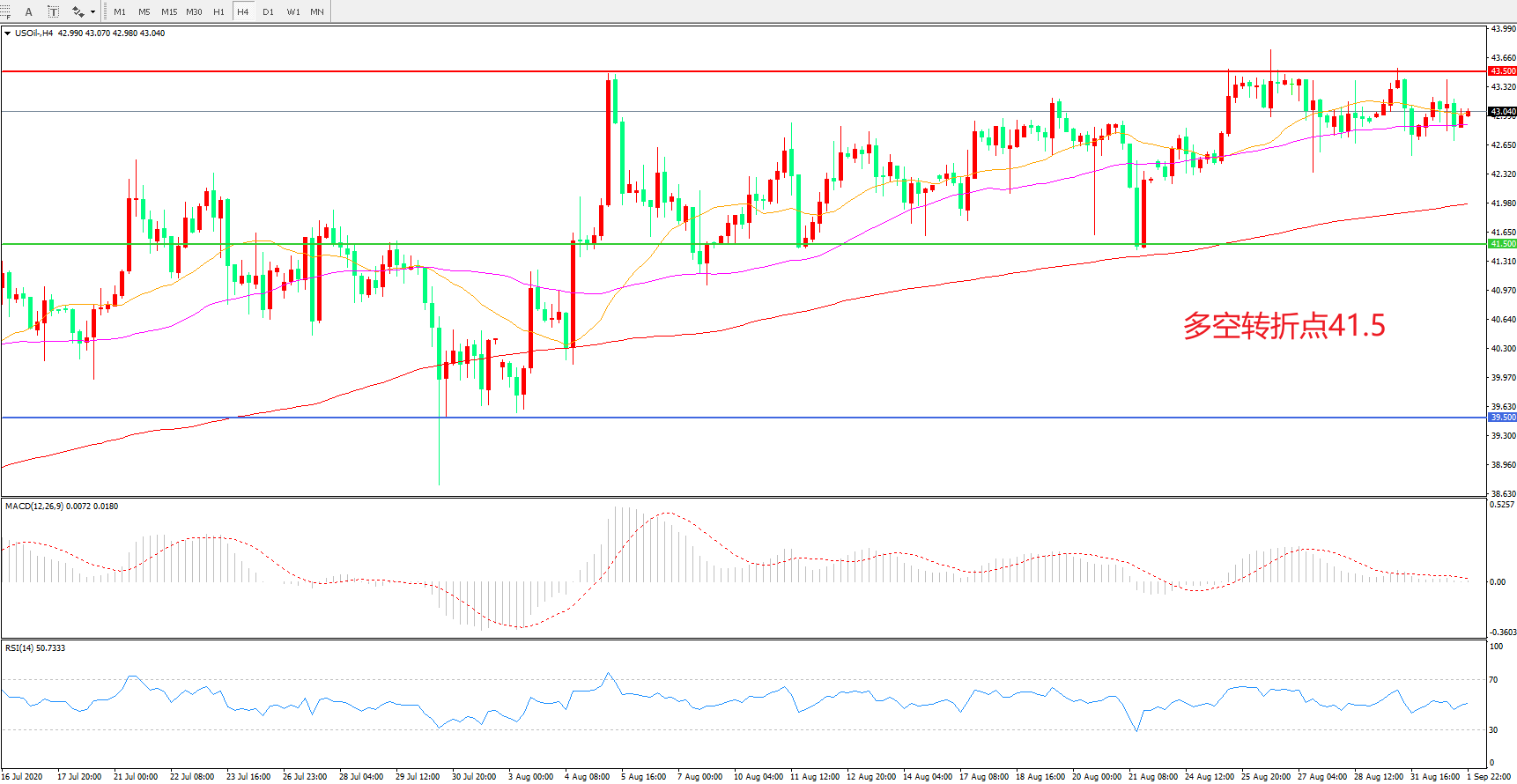 4小时图看,油价触及43.5阻力后出现震荡,整体走势再度陷入分歧,55均线再度成为短期支撑,MACD红柱减少,RSI指标向上,日内延续震荡概率较大。