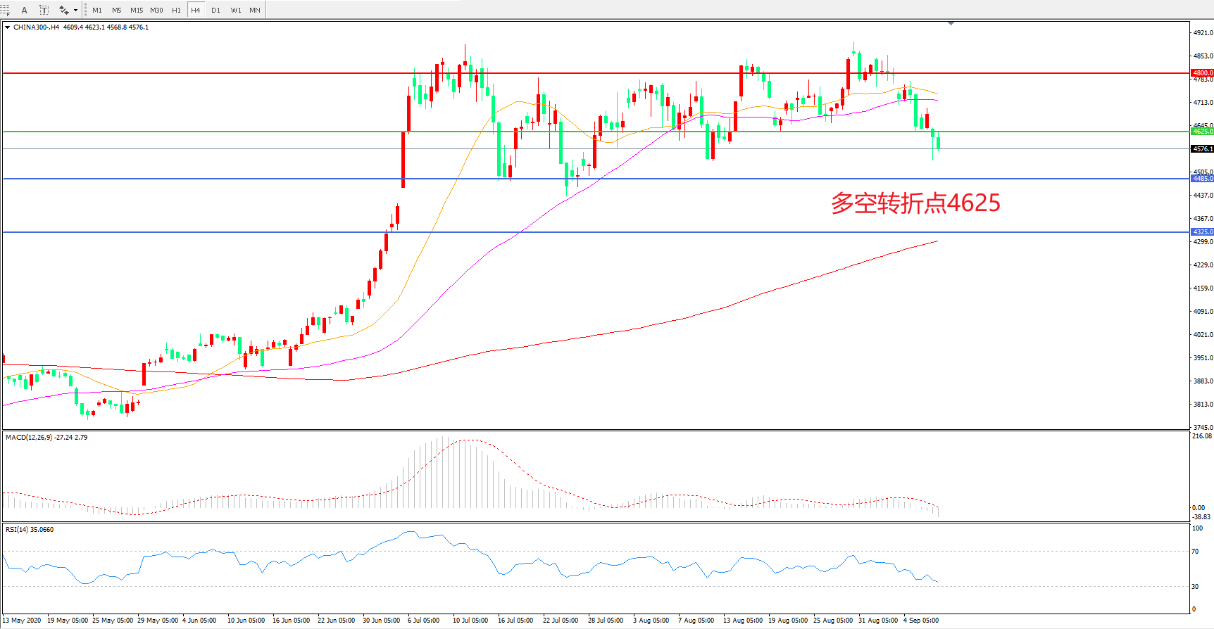 4小时图看,沪深300破位下行,短期走势相对疲软,均线系统走平, MACD绿柱增加,RSI指标向下,日内延续震荡概率较大。