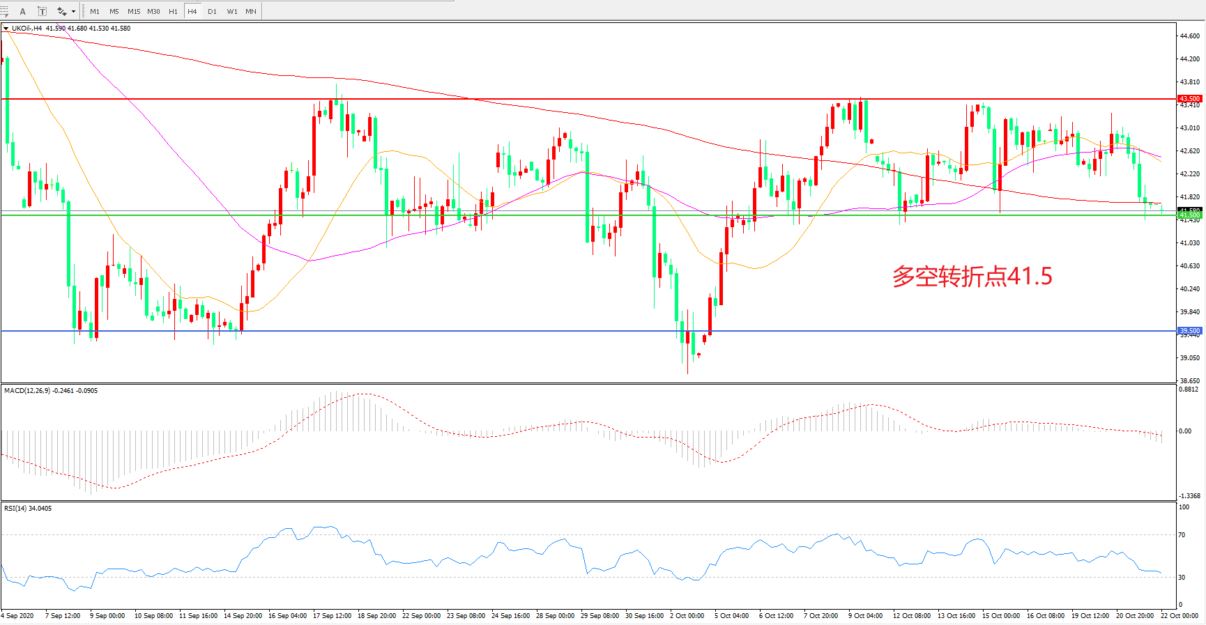 4小时图看,油价接近43.5一线后大幅下行,整体依旧维持箱体震荡形态,41.5成为下方支撑,MACD绿柱增加,RSI指标走平,日内延续震荡概率较大。