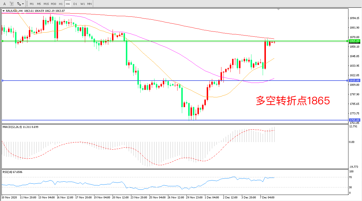周一(12月7日),美国疫情持续肆虐,市场对财政刺激政策预期增强,再通胀交易逻辑主导市场,现货黄金开启暴力拉升模式,大幅走高后收报1863.22美元/盎司。近期英国首相约翰逊告知欧盟,他不会改变立场,这意味着与欧盟谈判彻底决裂。避险情绪的走高也是金价大幅拉升的原因之一。