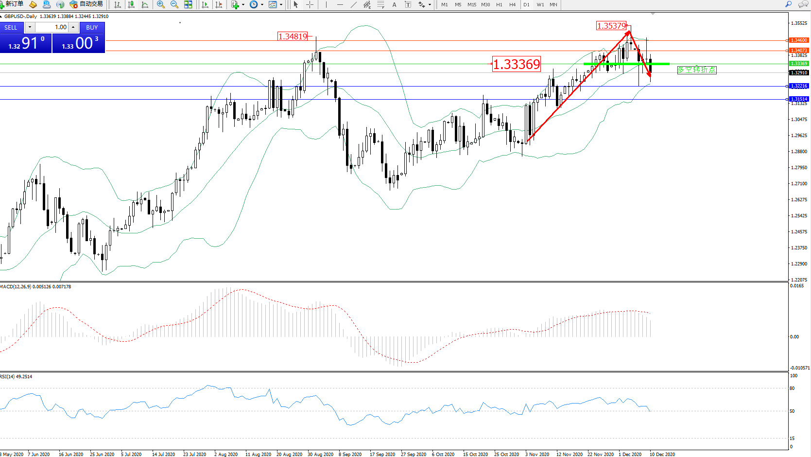 交易策略:1.33369下方看跌,目标1.32216、1.31514