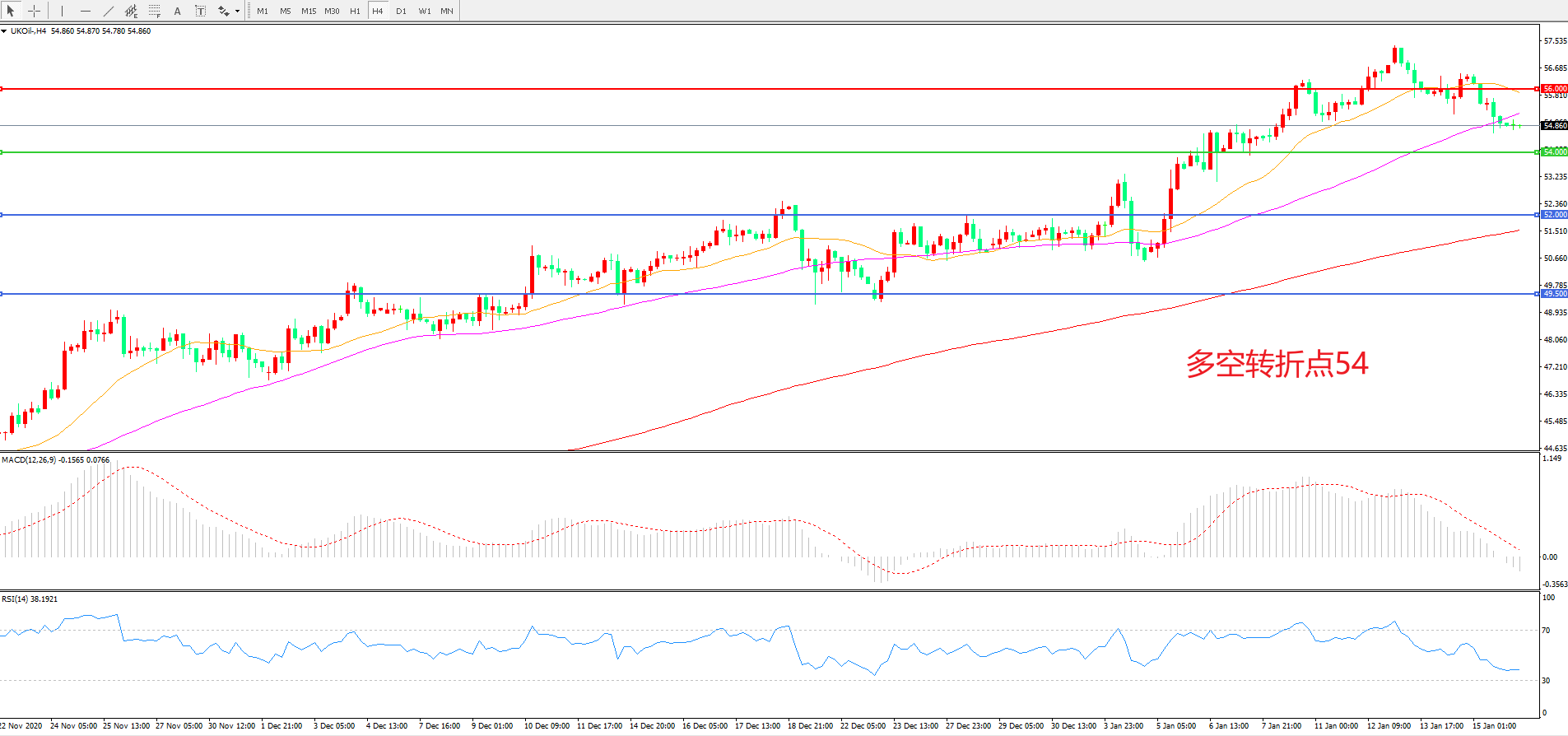 交易策略:  在54.00之上看涨,目标56.00      60.00