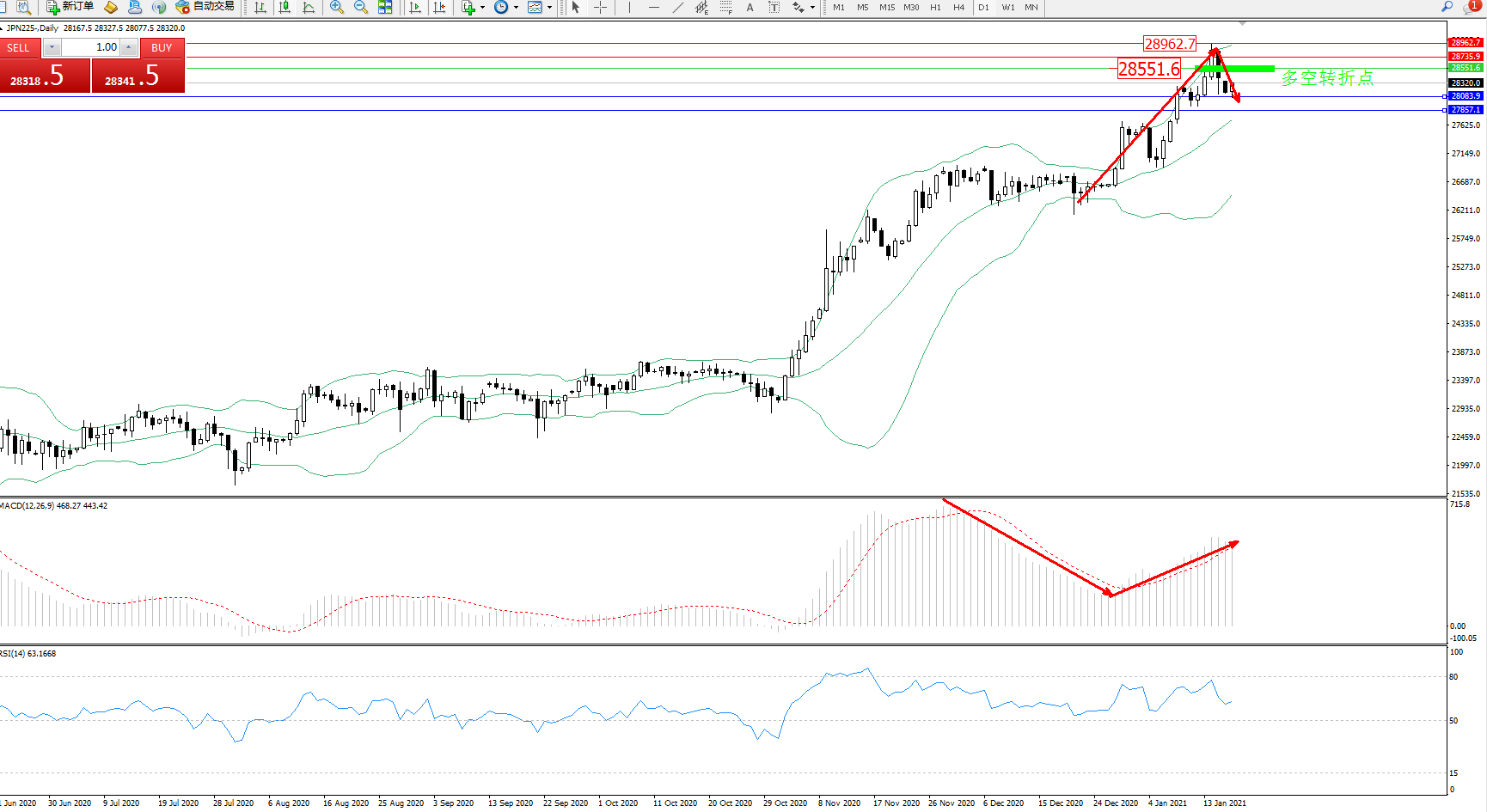 日经225指数1月18日(周一)收盘下跌263.18点,跌幅0.92%,报28256.00点。日本东京新增1204例新冠肺炎确诊病例。日本首相菅义伟:决心领导抗击新冠肺炎疫情,克服困难。将修订疫情法律,增加惩罚和激励措施。准备在2月底开始疫苗接种。将尽一切可能保护医疗系统。“绿色”增长将在2050年推动经济增长190万亿日元。将与日本央行合作,支持地区银行。目前重点关注疫情控制。力争尽早与美国当选总统拜登会晤,进一步巩固美日关系。韩国是重要邻国,但双边关系形势严峻。将继续东京奥运会的准备工作,建立严密的抗感染措施,给世界带来希望和勇气。