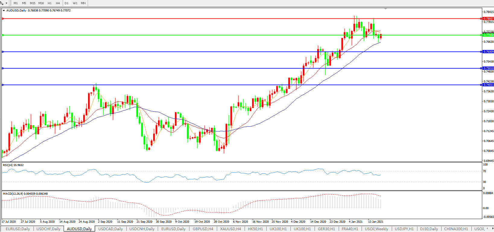交易策略:0.7700下方看跌,目标0.7600、0.7500