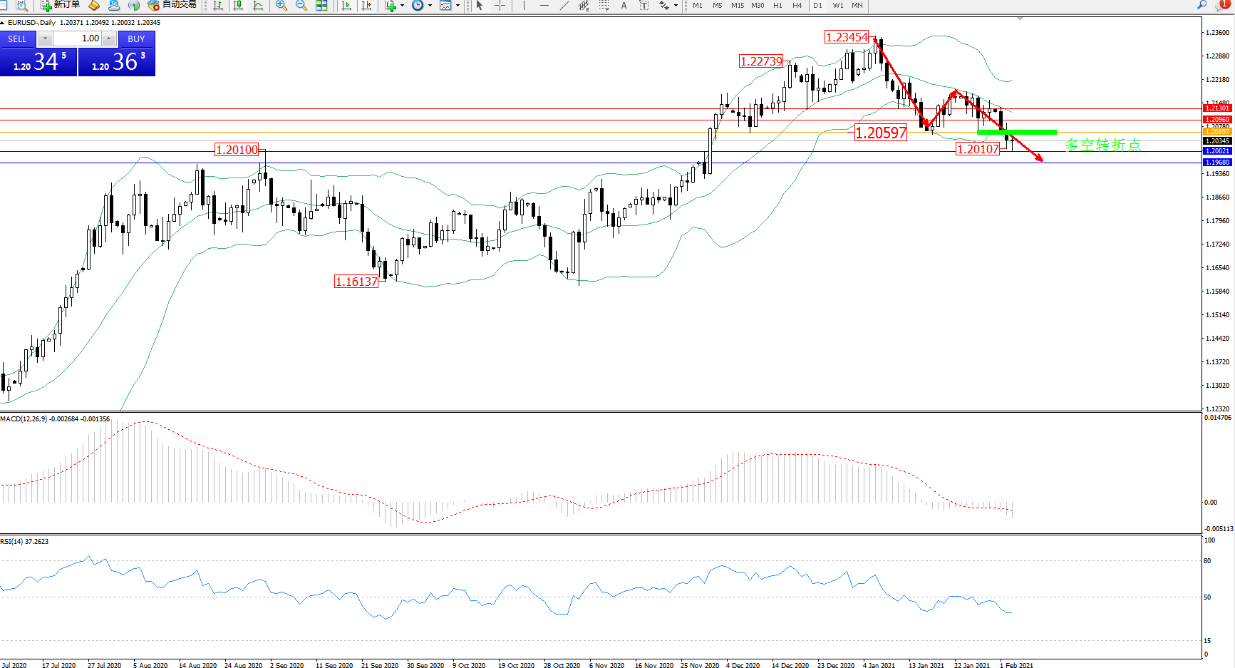 交易策略:1.20597下方看跌,目标1.20021、1.19680