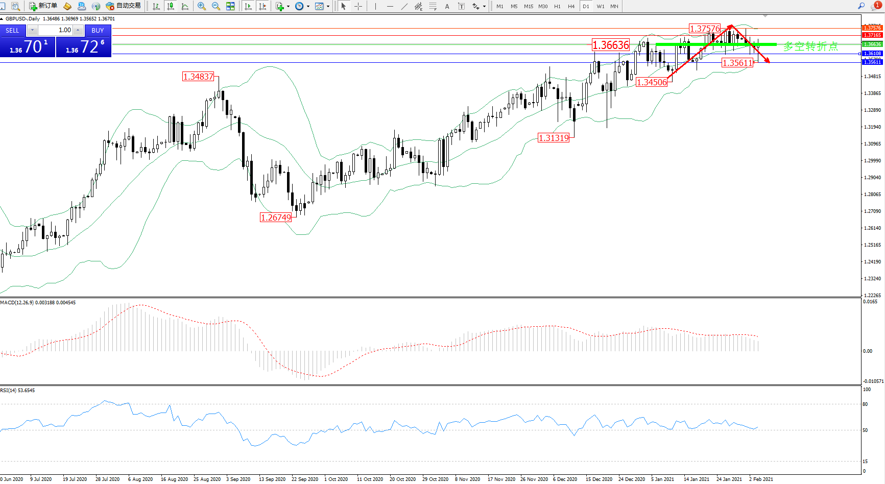 交易策略:1.36636上方看涨,目标1.37165、1.37576
