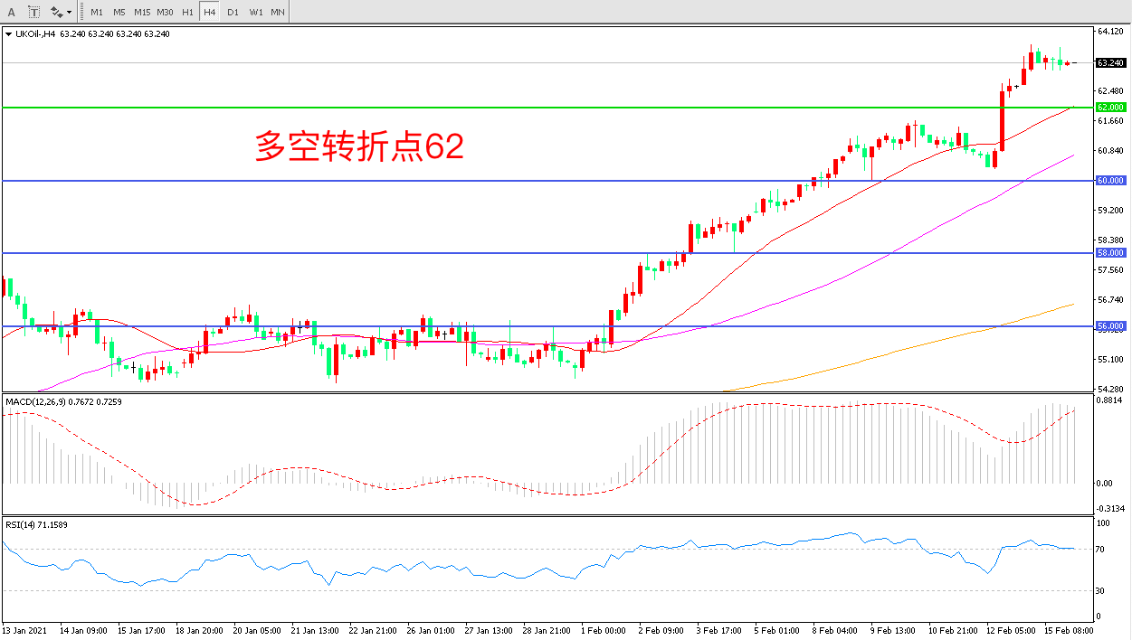 4小时图看,油价连续上涨后高开高走,上行趋势十分明显,62美元被强势突破,行情进入加速上行阶段,MACD红柱增加,RSI指标向上,日内延续上行概率较大。