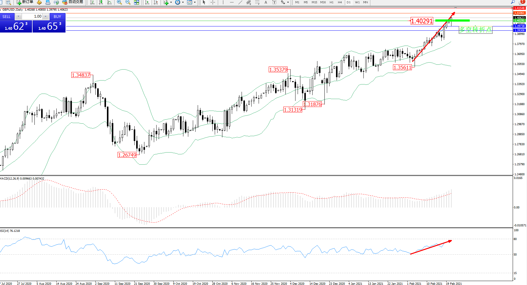 交易策略:1.40291上方看涨,目标1.41061、1.41548