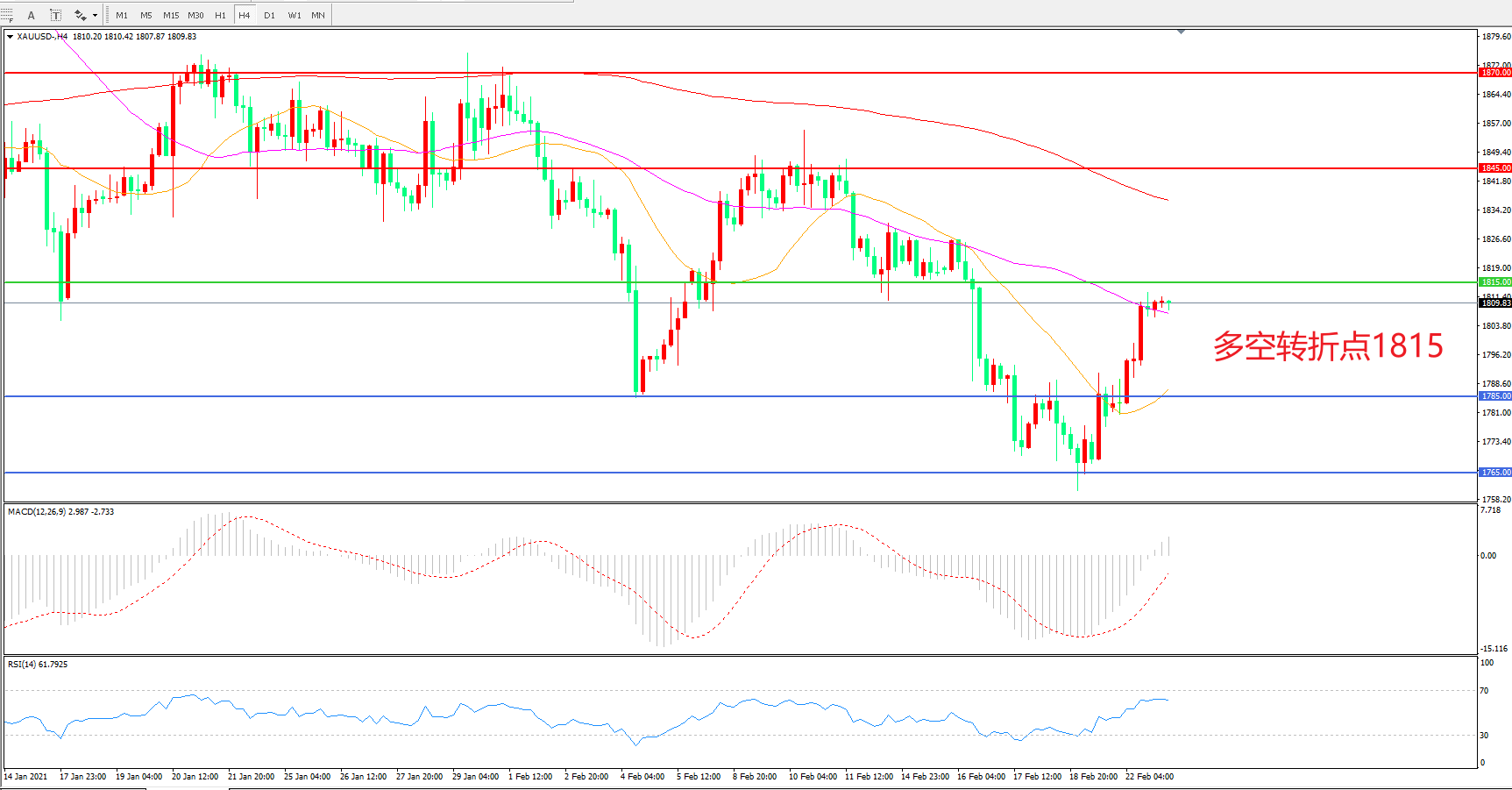 4小时图看,金价回踩1765后大幅反弹,短期表现相对强势,1815成为短期分水岭,但均线系统仍呈空头排列,MACD绿柱减少,RSI指标走平,日内延续下行概率较大。