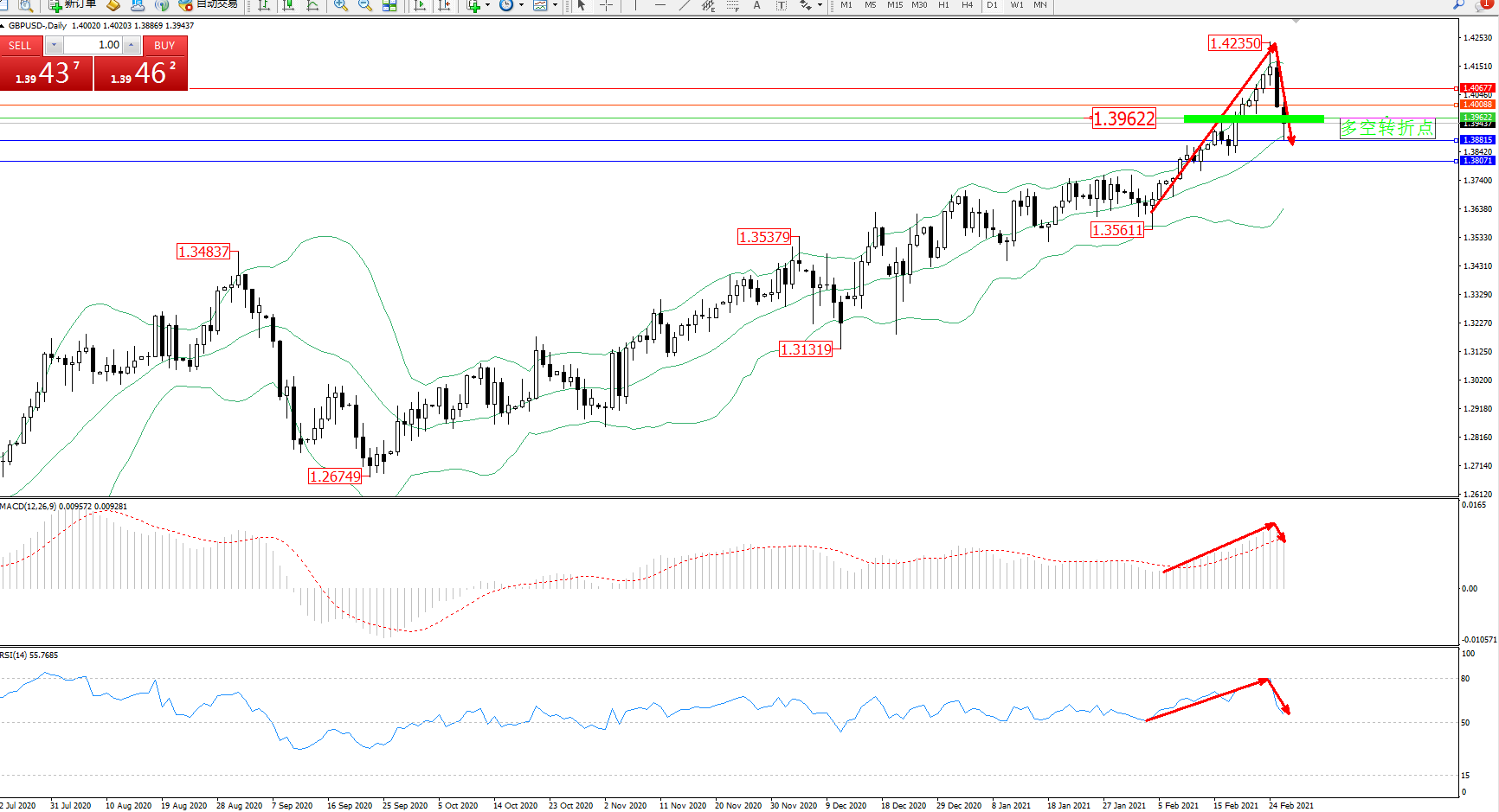 技术点评:多头动力延续布林带指标通道上轨附近持续震荡上扬态势良好,高位抵达1.42350附近节点遇阻反转急速下挫,触及布林带指标中轨附近节点后开始整理,布林带指标呈张口走势后开始有收口迹象,MACD指标处于多头区域维持整理上移后开始反转下移,RSI指标处于多头区域维持整理上移至超买区80均衡线附近遇阻开始反转急速下挫;