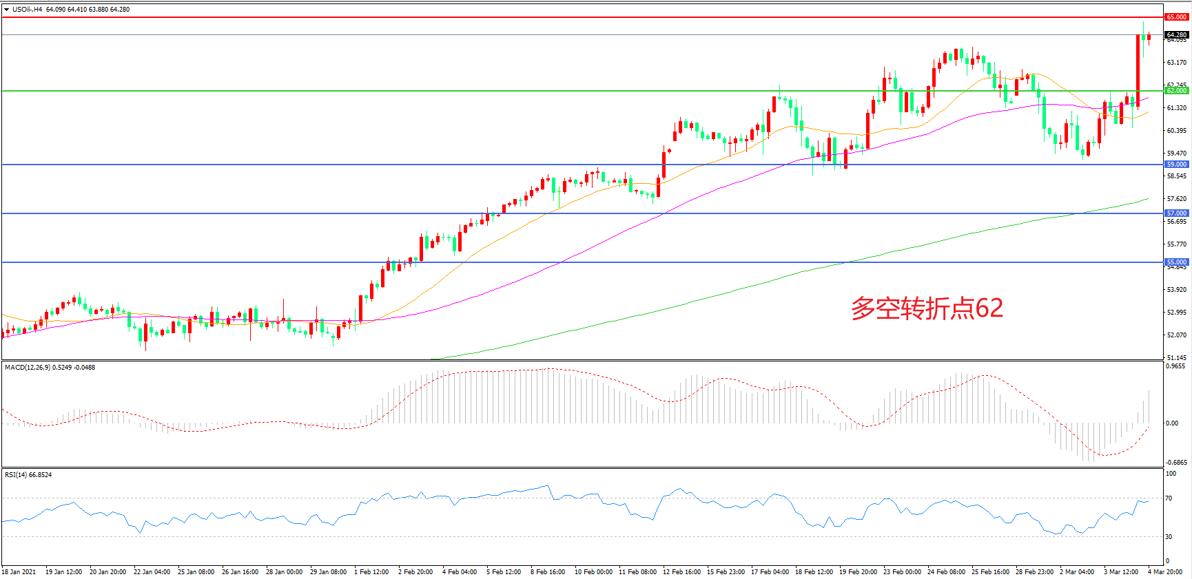 周四(3月4日),原油市场再传重磅利好!沙特及OPEC+盟国决定继续控制石油供应,令原油市场震惊,此前市场普遍认为将至少联合增产50万桶/日,但OPEC+意外决定4月不再增产且沙特将在4月维持自愿原油减产规模100万桶/日,市场情绪被瞬间燃爆,美国WTI原油暴力拉升近4%,最终收报63.98美元/桶。
