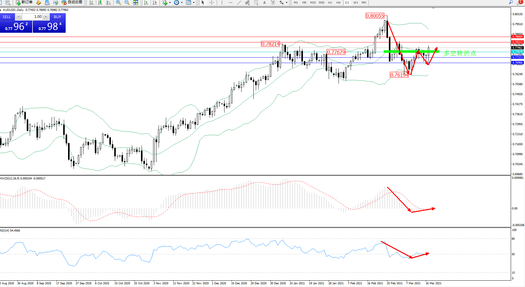 交易策略:0.77679上方看涨,目标0.78313、0.78669