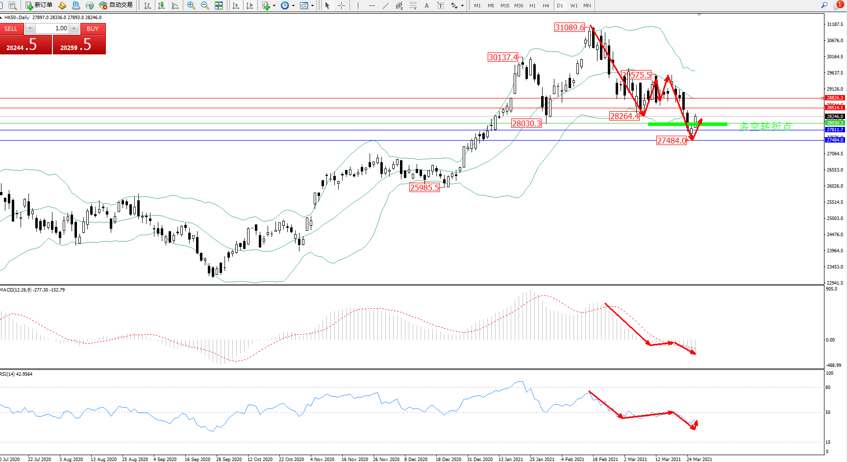 技术点评:空头动力延续布林带指标探通道中下轨区间持续震荡下行,跌破下轨抵达27484位置后得到支撑开始反转上移,多头动力有伺机入场态势,布林带指标呈张口走势后开始有收口迹象,关注下轨附近节点,MACD指标空头动力维持震荡缓慢下行至0轴线下方空头区域不断下行,RSI指标处于50均衡线下方维持窄幅整理中;