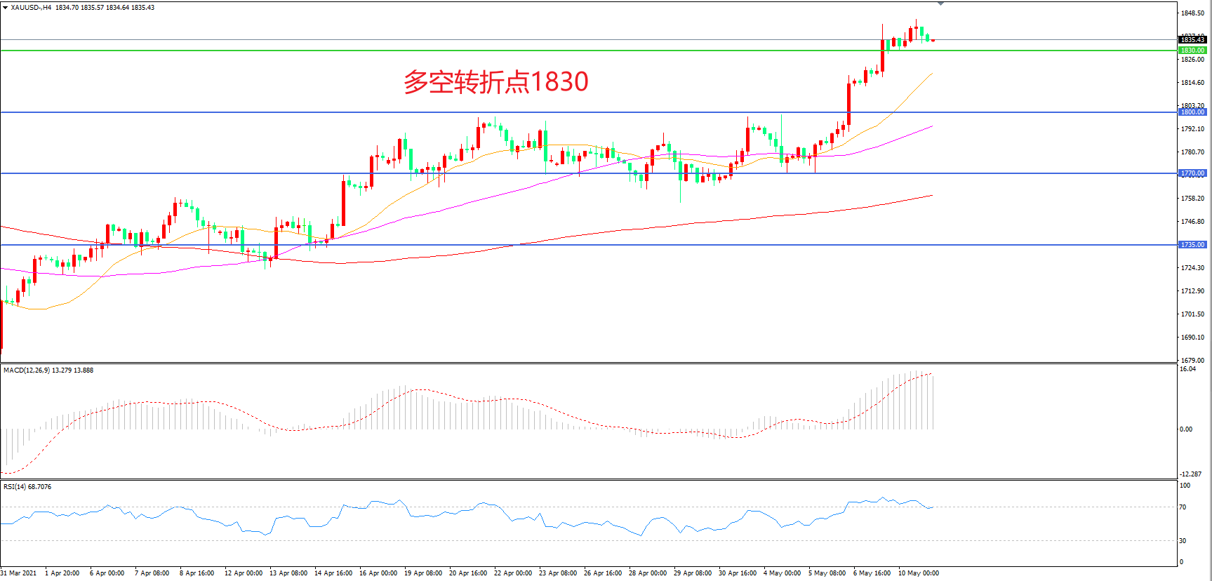 周一(5月10日),铜等大宗商品最近高涨,引发市场对通胀的担忧,10年期美债收益率重上1.60%,创下两月新低的美元指数逐步抹平日内跌幅,现货黄金延续高位震荡态势,小幅回调后收报1834.77美元/盎司。一方面美元贬值、美联储货币政策保持原有基调为黄金上行构筑了良好环境,另一方面,现货黄金维持在1800美元/盎司之上已有一段时间,从技术角度看也有上涨空间。