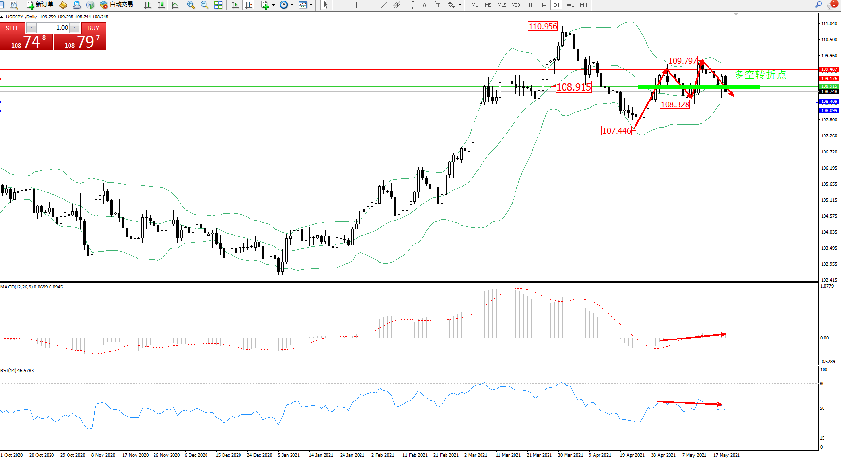 技术点评:低位多头动力持续震荡上扬,高位抵达布林带指标上轨附近109.797节点后遇阻回撤,维持在中轨附近继续窄幅震荡中,短期或有继续弱势平缓下移迹象,布林带指标呈缓慢收口走势平移后有继续徘徊迹象,MACD指标处于0轴线附近弱势徘徊中,RSI指标处于50均衡线附近维持窄幅震荡;