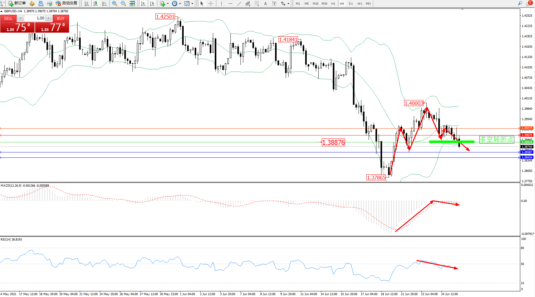 交易策略:1.38876下方看跌,目标1.38587、1.38434