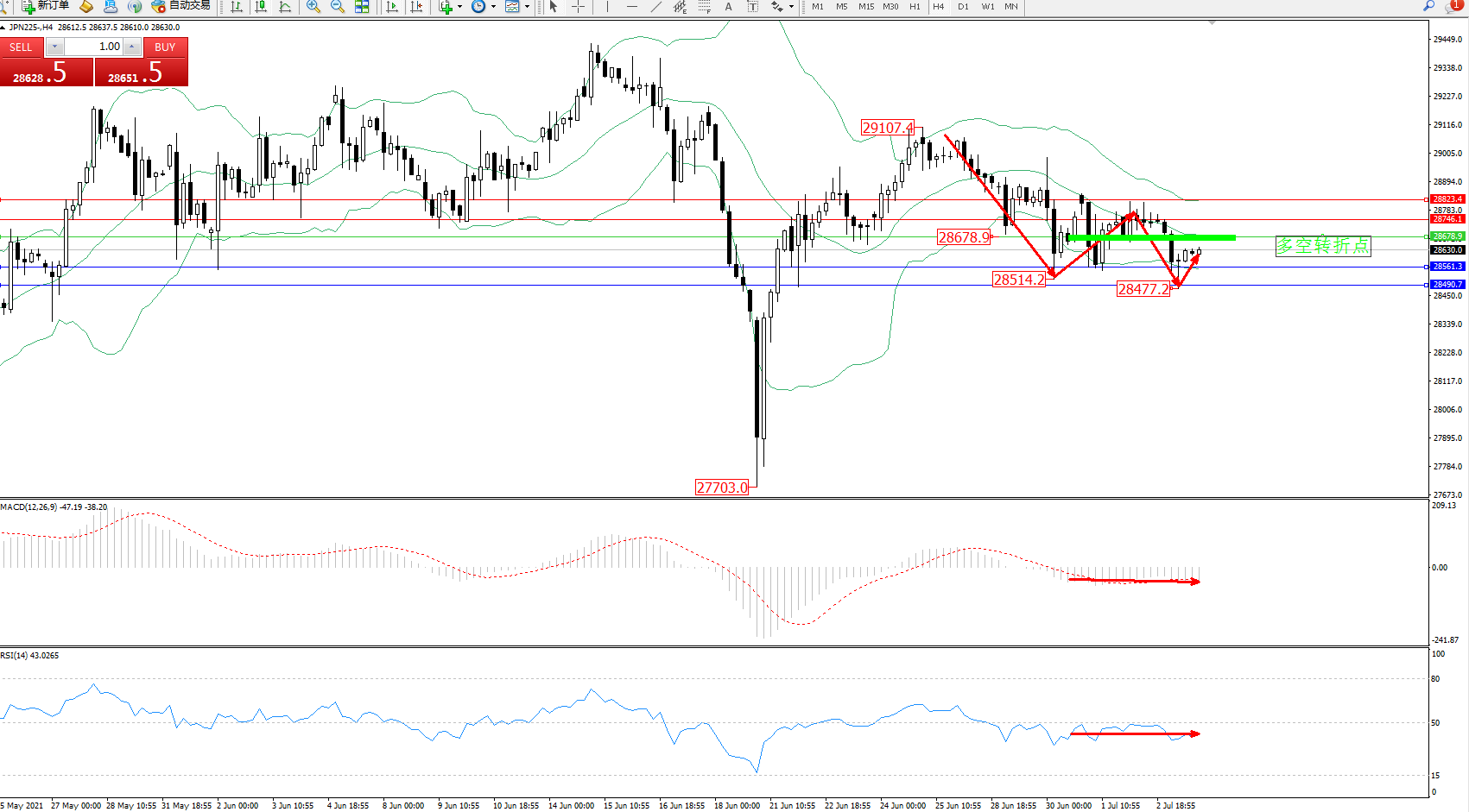 日经225指数7月5日(周一)收盘下跌177.78点,跌幅0.62%,报28605.50点。日本央行行长黑田东彦:日本金融体系整体保持稳定。日本经济有回暖的趋势。核心消费通胀可能逐步加速。将毫不犹豫地采取额外的宽松措施,以应对疫情的影响。随着疫情的影响逐渐消退,日本经济可能会复苏。日本央行上调了日本9个地区中的2个地区的(经济)评估,下调2个地区的(经济)评估,维持5个地区的(经济)评估不变。许多地区的经济复苏是一种趋势。日本第一季度的产出缺口为-1.37%。上调近畿地区的经济评估是由于出口、产出和资本支出表现更强劲。日本央行通过私人资金,在加强增长基础上的行动中发挥了非常重要的作用。