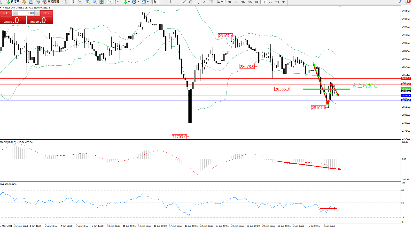 技术点评:空头动力延续布林带指标通道中下轨区间持续震荡下行,跌破下轨后抵达28107位置附近开始震荡回升,纠结于中下姑且叫持续整理中,空头下行动力开始短暂止步,布林带指标呈张口走势后开始收口向下移动中,MACD指标处于0轴线下方空头区域维持整理徘徊中,RSI指标处于50均衡线下方空头区域持续震荡后整理;