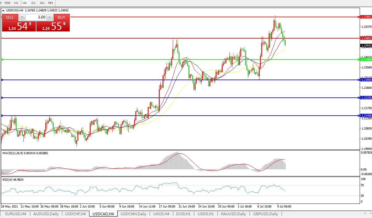 美元兑加元跌0.69%至1.2447,因油价上涨,且数据显示加拿大6月份新增就业岗位超预期,因该国多个地区放宽了公共卫生限制;有关加拿大6月份新增就业超预期的报告也给美元兑加元带来压力。1.2405-1.2610区域是关键,可能是新的短期限制;上次在这个区间是3月和4月,之后的通货再膨胀交易令美元兑加元跌破下限。