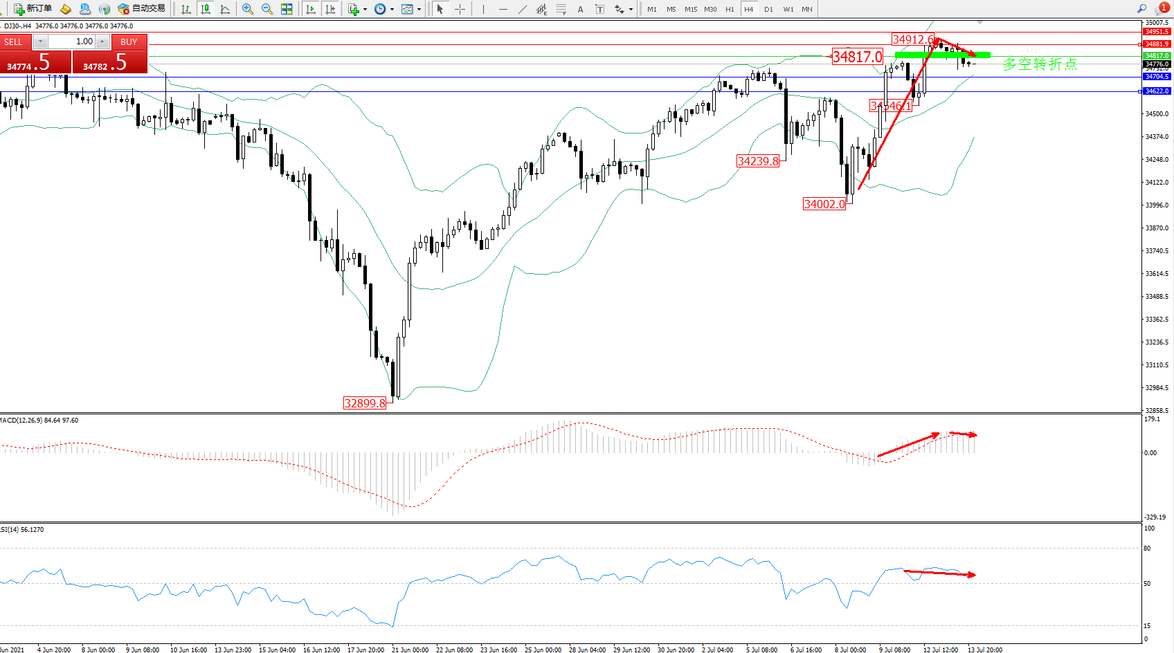 技术点评:低位多头动力持续震荡上扬,高位抵达34912位置节点后遇阻整理回撤,即将触及布林带指标中轨附近节点,布林带指标呈收口走势持续中,MACD指标处于0轴线上方多头区域维持整理平移,RSI指标处于50均衡线上方多头区域持续震荡平移;