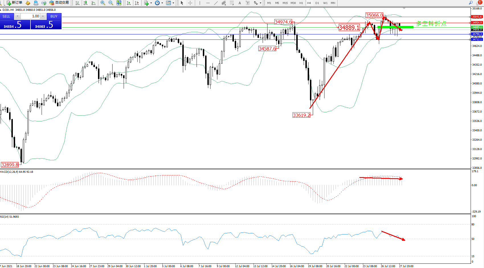 技术点评:多头动力延续布林带指标通道中上轨区间持续震荡上扬后,高位波幅空间逐渐收窄,布林带指标呈收口走势持续中,高位35006附近压制短期存在,MACD指标处于0轴线上方多头区域维持整理徘徊,RSI指标处于50均衡线上方弱势震荡缓慢下移中;