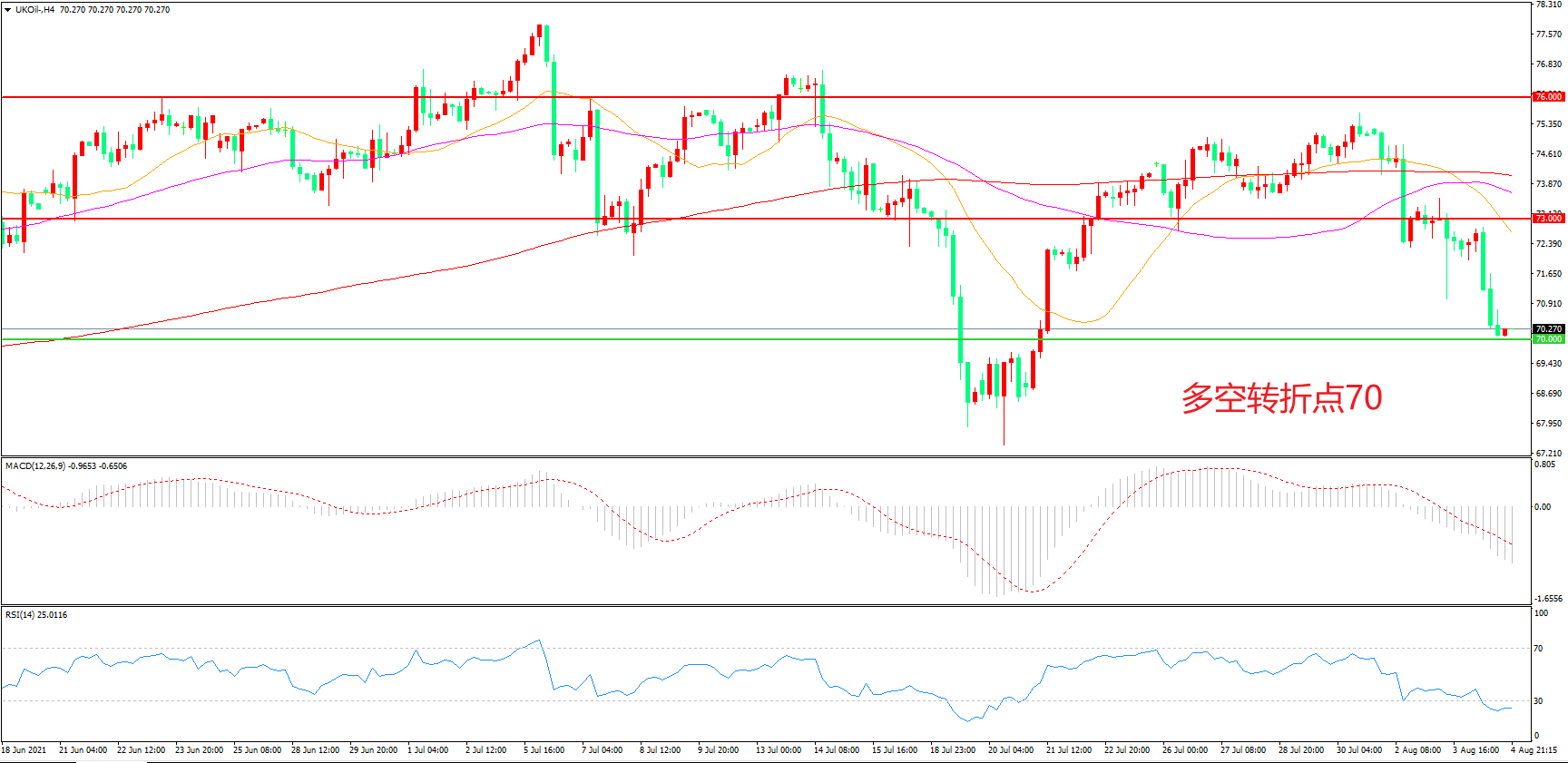 4小时图看,油价低位盘整后破位下行,整体表现低迷,均线系统成为上方阻力,70美元成为多空分水岭,MACD绿柱增加,RSI指标走平,日内震荡下行概率较大。