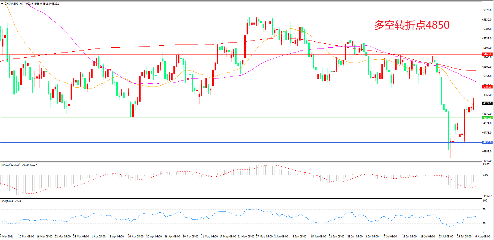 4小时图看,沪深300以4850为依托震荡走高,短线行情有所回暖,55均线逐渐下压,5000点成为上方阻力,MACD绿柱减少,RSI指标走平,日内震荡上行概率较大。