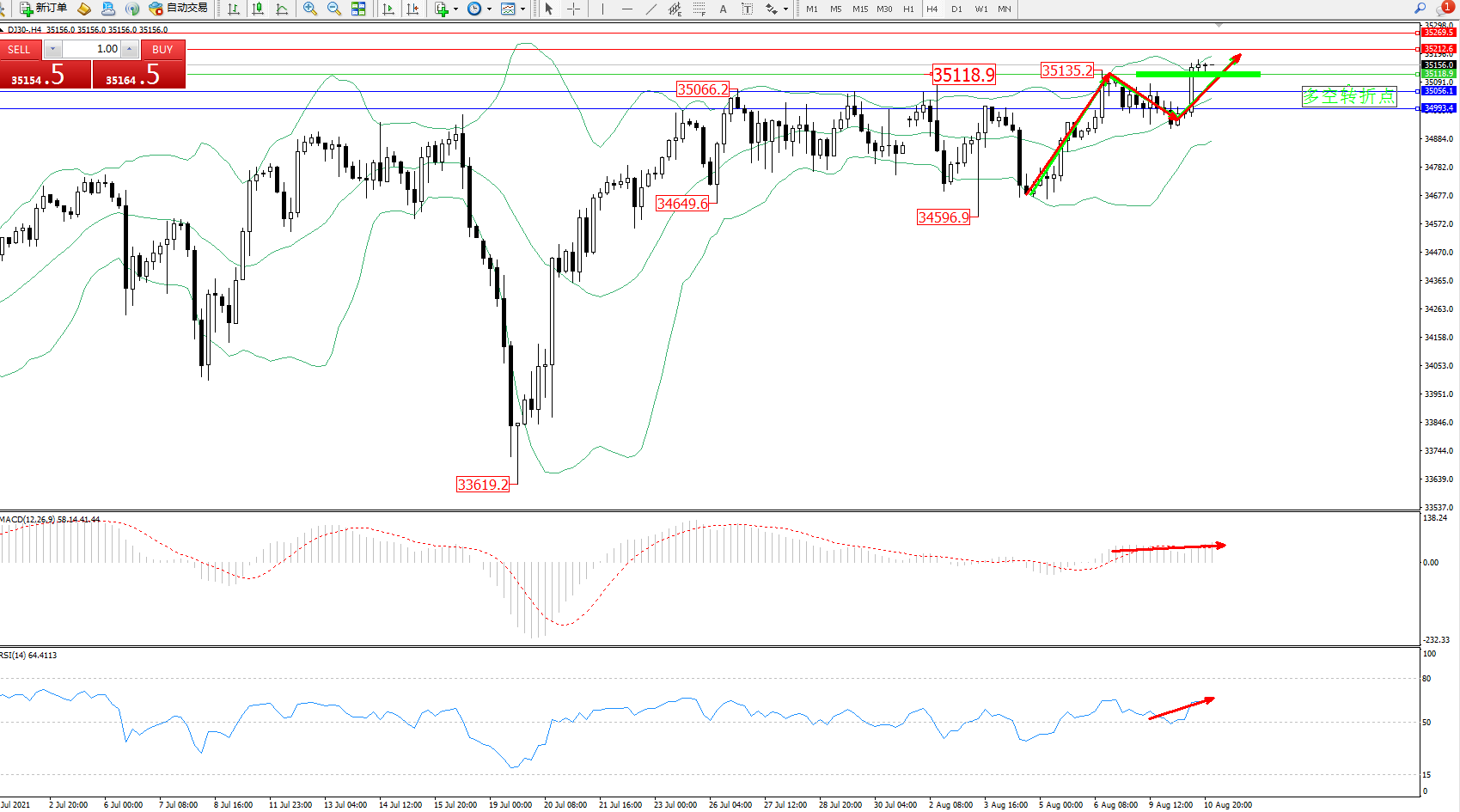 道琼斯指数8月10日(周二)收盘上涨162.75点,涨幅0.46%,报35264.60点;美股三大股指收盘涨跌互现,道指初步收涨,美国7月消费者物价指数(CPI)年率料小幅走低至5.3%,6月录得13年高点5.4%。剔除动荡的食品和能源价格的核心CPI年率料从4.5%下降至4.3%。继多位美联储官员发表讲话以及强劲的7月就业报告发布后,投资者目前预期美联储将在年底前开始缩减购债规模。美联储的政策前景转为鹰派的确认提振美元,且美元指数攀升突破93.00,为三周以来首次。