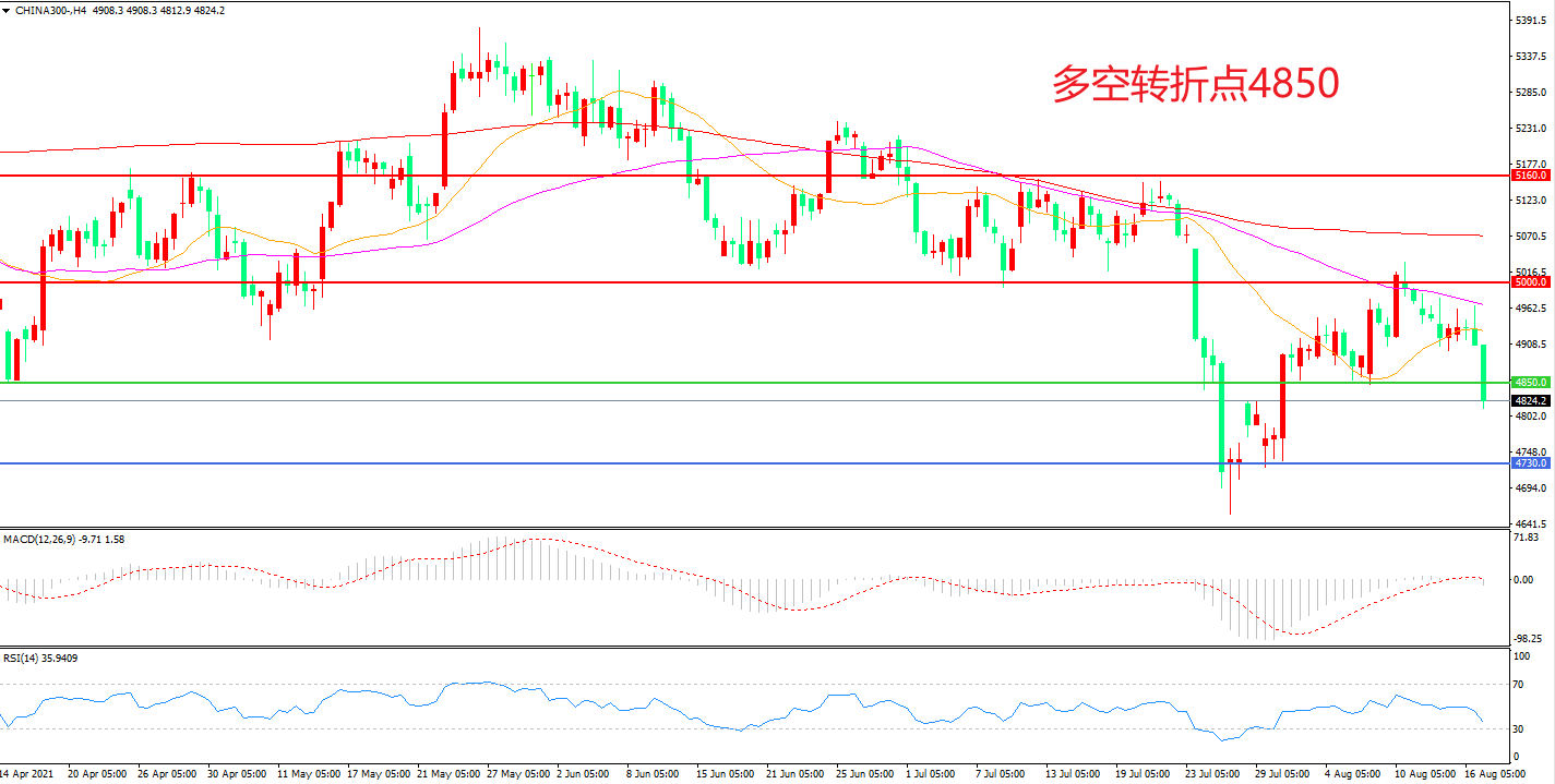 4小时图看,沪深300受阻于55周期均线压力,长阴破位后下行趋势较为明显,4850成为多空分水岭,MACD绿柱增加,RSI指标向下,日内震荡下行概率较大。