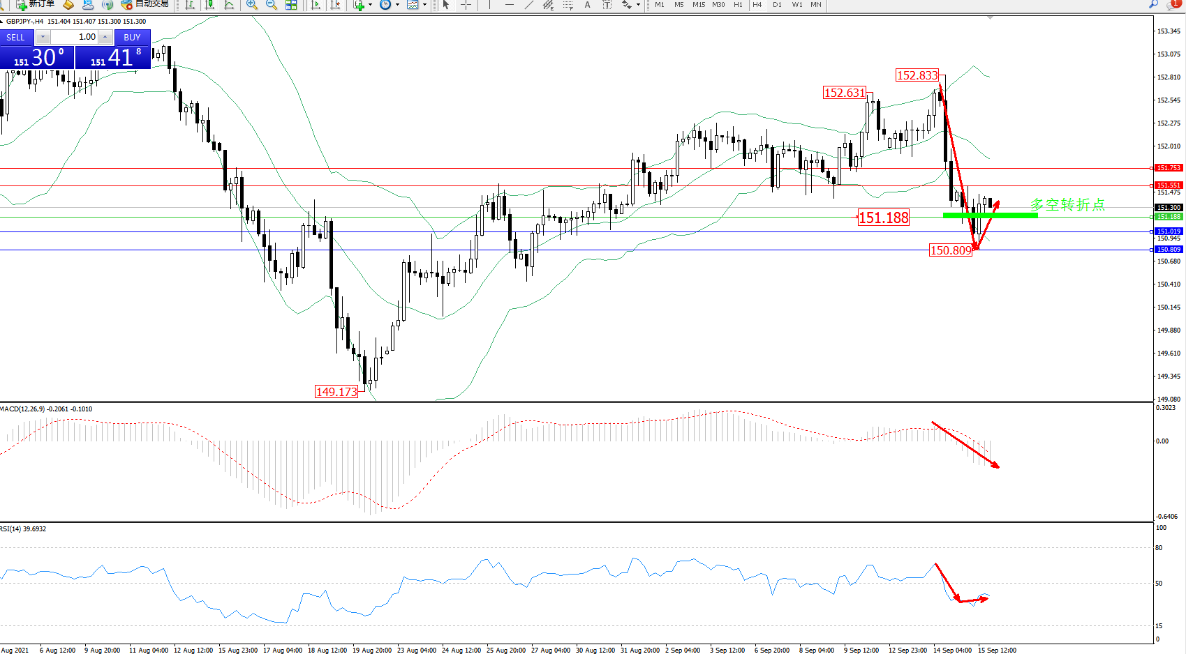 技术点评:高位空头动力急速下挫,低位抵达150.809位置后得到短暂支撑反转上移,低位多空动力或将维持窄幅整理中,布林带指标呈张口走势后开始缓慢收口, MACD指标处于0轴下方空头区域维持整理平移,RSI指标处于50均衡线下方空头区域维持整理中;