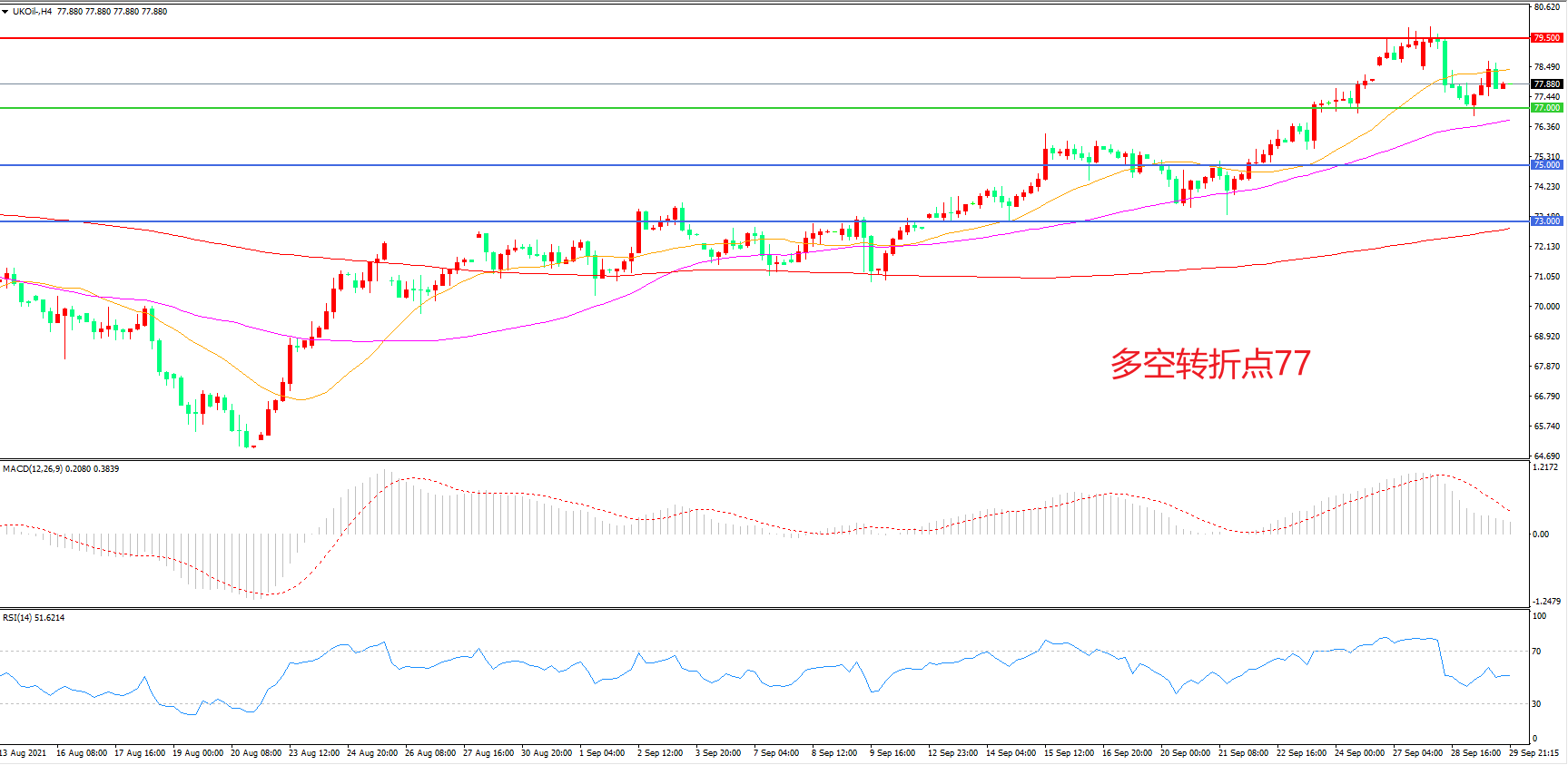 4小时图看,油价整体呈现冲高回落形态,55周期均线成为下方支撑,79.5成为上方阻力,MACD红柱缩短,RSI指标走平,日内震荡上行概率较大。