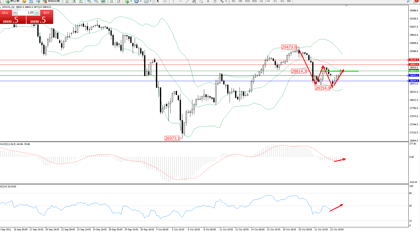技术点评:高位空头动力延续布林带指标通道中下轨区间持续震荡下行,低位抵达28354位置节点后开始反转上移,触及布林带指标中轨附近节点后有继续向上移动态势,布林带指标呈收口走势中,MACD指标处于0轴线下方空头区域维持整理平移,RSI指标处于空头区域维持整理回升至50均衡线附近震荡;