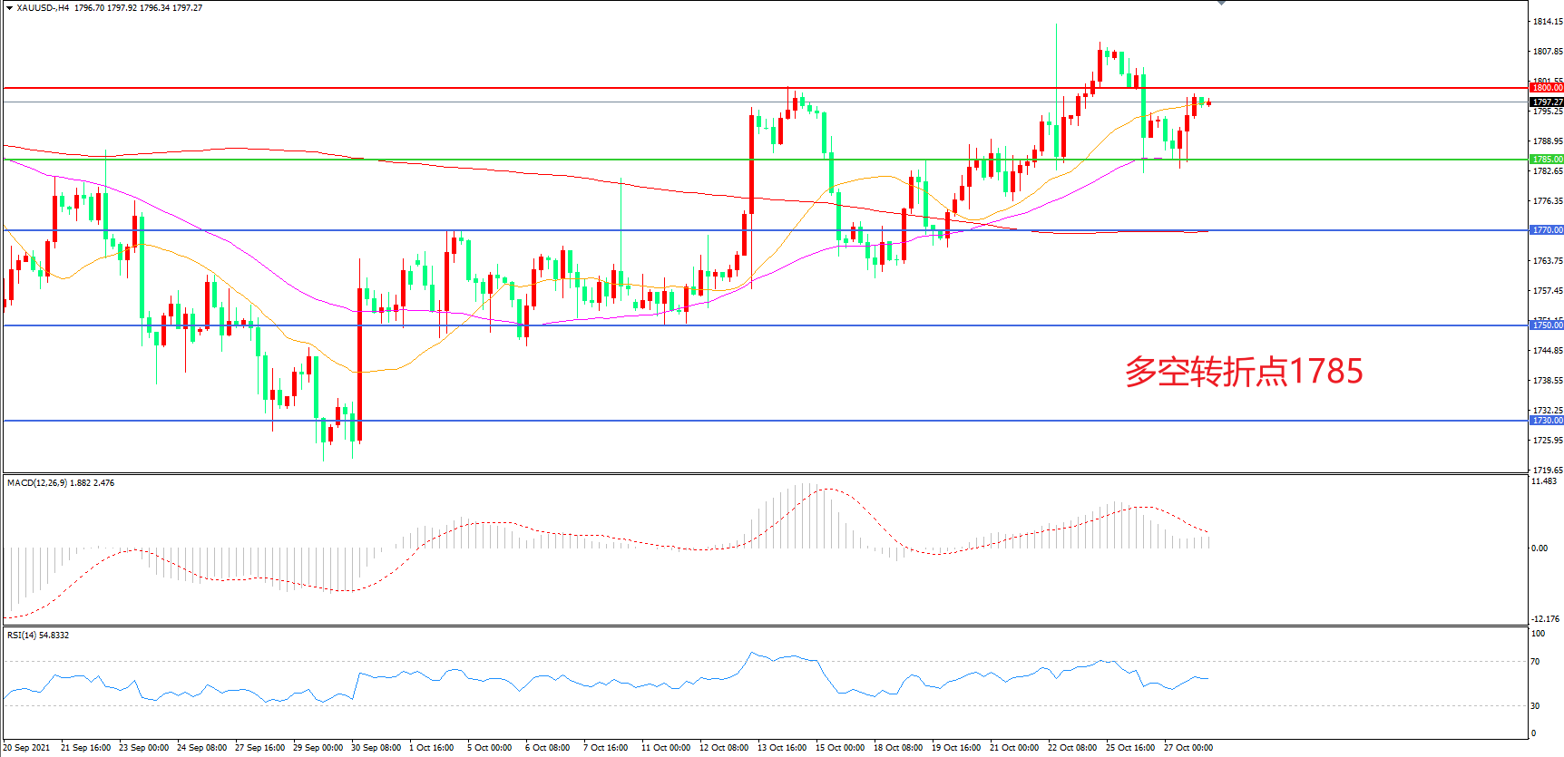 4小时图看,金价回踩1785支撑后再度上行,下方支撑的到确认,区间震荡迹象明显,均线系统逐渐走平,MACD红柱减少,RSI指标走平,日内延续震荡概率较大。