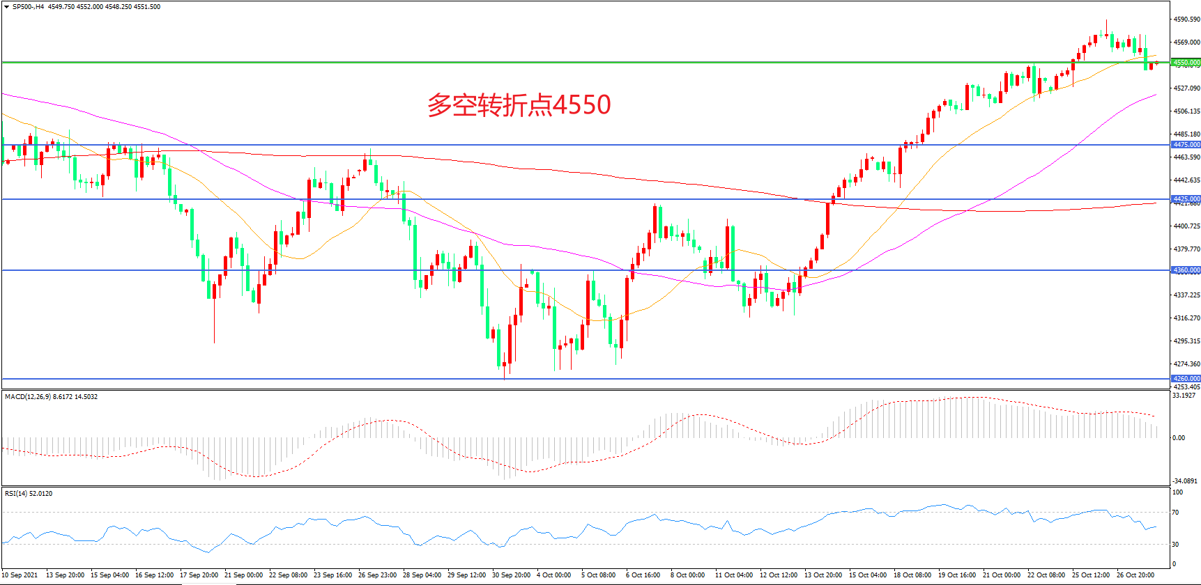 周三(10月27日),部分科技巨头的财报表现依然抢眼,但受累于大宗商品大多下跌,能源板块的疲软表现妥了美股,标普500小幅回调,收报4550点。目前投资者仍在评估大型科技公司及行业巨头财报,同时对通胀的担忧继续压制市场情绪,短期美股延续高位震荡的概率较大。