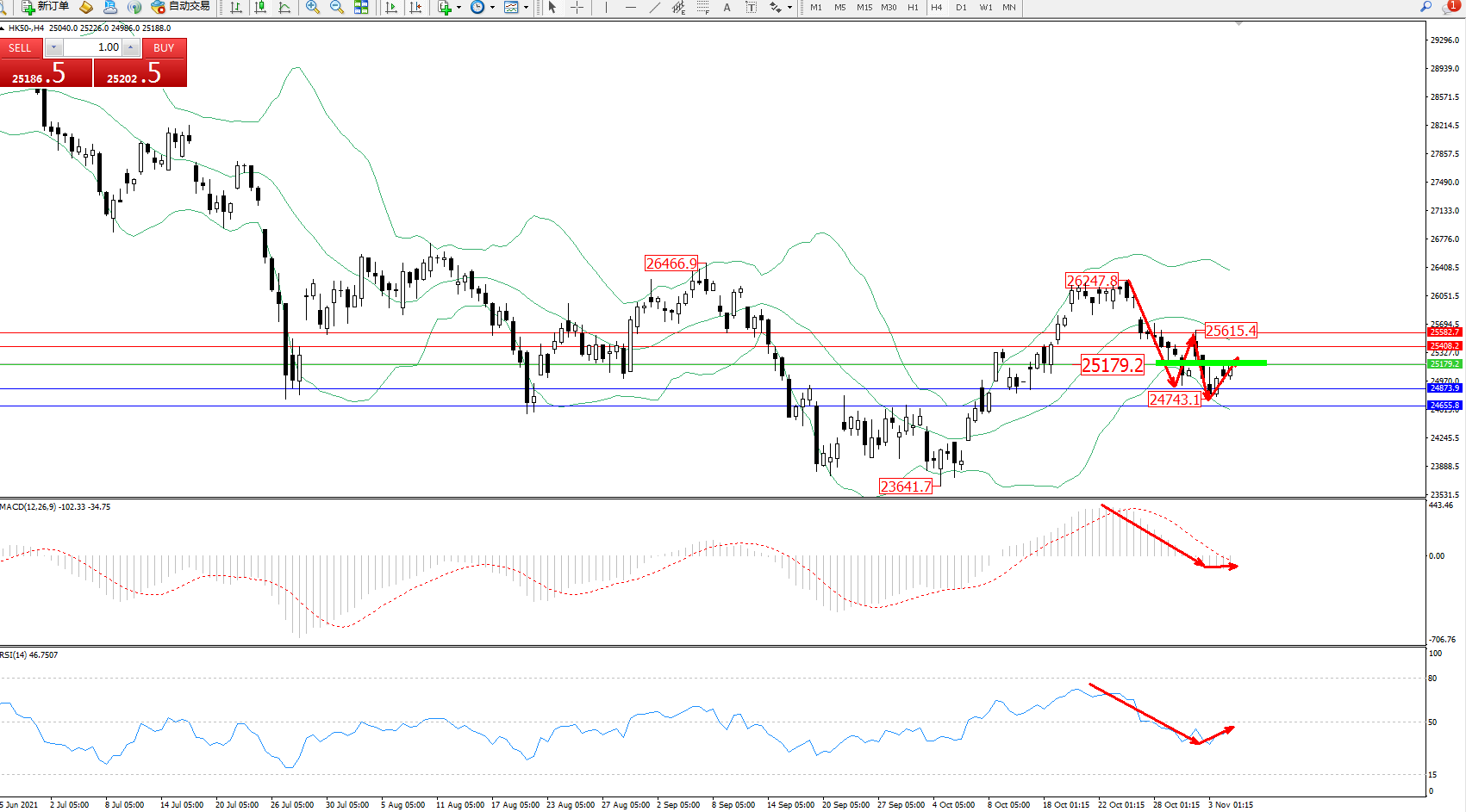 香港恒生指数11月4日(周四)收盘上涨200.44点,涨幅0.8%,报25225.19点;港股三大指数全线收涨,恒生科技指数涨1.62%报6375点。今日大市成交额为1186亿港元,南下资金净流入21.32亿港元。国务院港澳事务办公室称,中央始终十分关心香港的疫情形势,多措并举支持香港统筹做好疫情防控和经济社会发展工作,中央有关部门高度重视在疫情常态化防控下恢复内地与香港“通关”的问题。内地与香港的防疫专家近日已经再次举行会议,共同研判两地疫情,并聚焦防范疫情跨境传播的一系列具体问题深入讨论,取得了许多共识。可以说,双方正相向而行,两地恢复“通关”的工作正有序推进。
