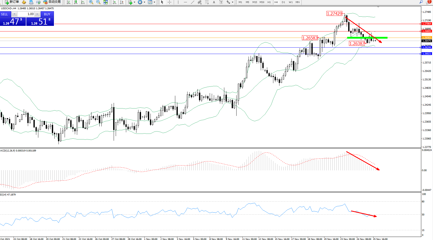 技术点评:多头动力延续布林带指标通道中上轨区间持续震荡上扬,高位抵达1.27429位置后遇阻震荡回撤下行,纠结于中下轨区间弱势震荡,短期空头动力有继续向下移动态势,布林带指标呈收口走势持续平移中,MACD指标高位空头动力维持震荡下行至0轴线附近徘徊,RSI指标处于50均衡线下侧弱势整理平移中;