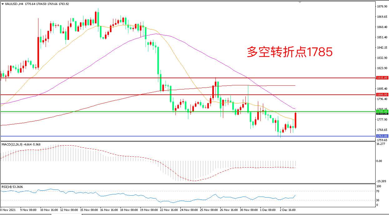上周五(12月2日),美国11月新增非农就业人数不到市场预期的一半,创去年12月以来最小增幅,现货黄金金短线走高,收报1783.92美元/盎司。重磅数据数据的波动让金价迎来短暂曙光,但2022年FOMC票委布拉德在非农公布后的讲话中重申支持美联储加快缩债步伐,中期看美联储鹰派加息依然是悬在金价头顶的“利剑”,1785将成为市场争端的下一个焦点。