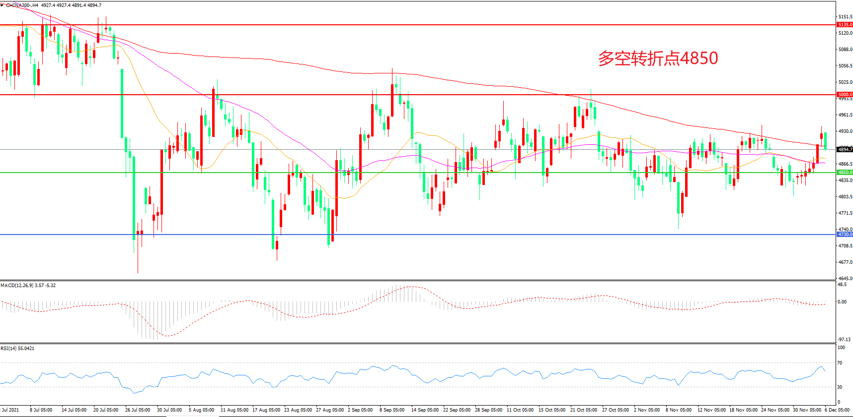 4小时图看,沪深300突破200均线后冲高回落,短期表现回调,但盘中反弹趋势已经形成,5000点成为短期阻力,MACD红柱增加,RSI指标走平,日内震荡上行概率较大。