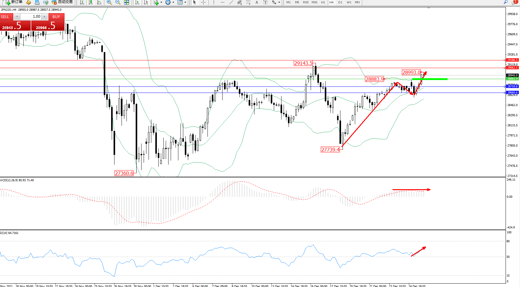 技术点评:多头动力延续布林带指标通道中上轨区间持续震荡上扬,高位抵达28993位置后开始整理,短期多头动力有继续攀升迹象,布林带指标呈高位收口走势中,且波幅空间逐渐收窄,MACD指标处于多头区域维持整理平移,RSI指标处于50均衡线上側维持震荡向上移动中;