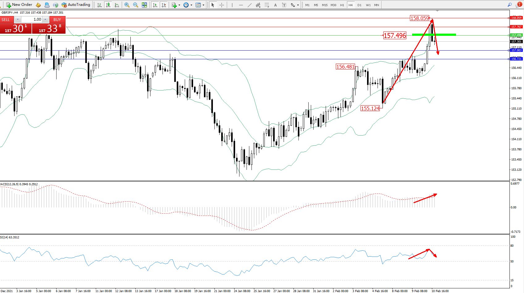 技术点评:多头动力延续布林带指标通道中上轨区间持续震荡上扬,高位抵达158.059附近遇阻回撤,短期高位空头动力伺机入场,布林带指标呈张口走势后开始有收口迹象,MACD指标处于多头区域维持缓慢上移,RSI指标处于多头区域维持震荡上移后开始回撤;