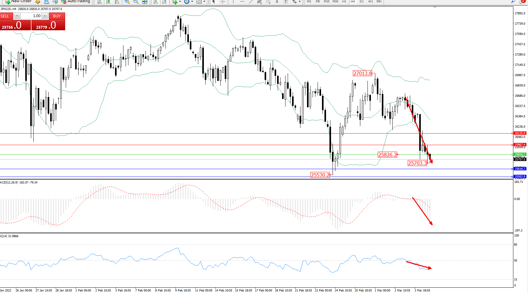 技术点评:空头动力延续布林带指标下轨附近不断震荡下行,低位抵达25703位置节点后短期整理,空头动力有继续向下移动态势,布林带指标呈张口走势良好,前期低位25530位置近在咫尺破位在即,MACD指标处于0轴线下方空头区域不断震荡下行,RSI指标处于50均衡线下侧弱势震荡向下徘徊中;