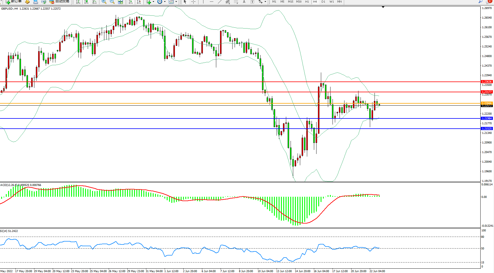 交易策略:1.22666下方看跌,目标1.21984、1.21525