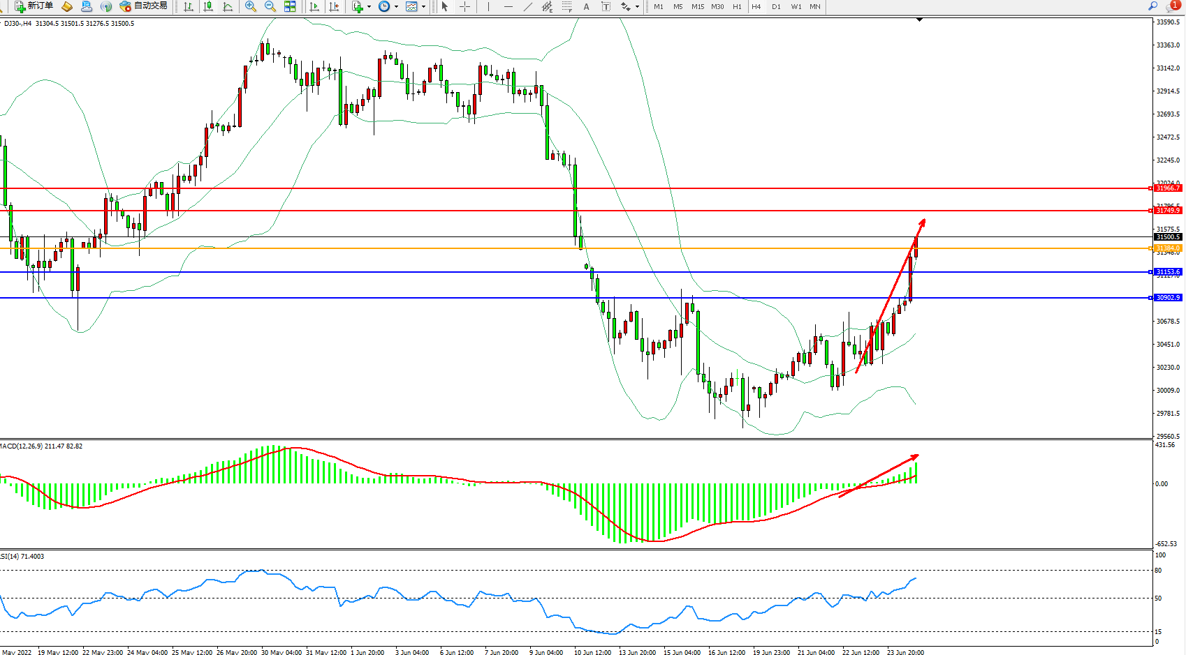 4小时图看:多头动力延续布林带指标上轨附近强势拉升上扬,短期多头上行走势或加将延续,布林带指标呈张口走势持续中,MACD指标处于多头区域维持震荡上移中,RSI指标处于多头区域持续拉升中;