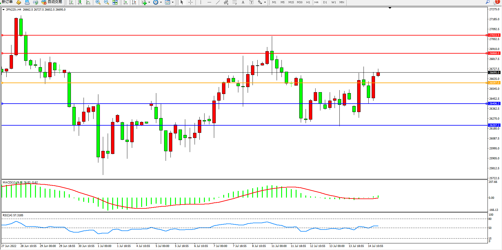 日经225指数7月14日(周四)收盘上涨162.73点,涨幅0.61%,报26641.50点。日本内阁官房长官松野博一:在与日本央行合作的同时更密切地关注外汇市场。将密切关注美国通胀趋势、货币政策变化将如何影响日本和全球经济。