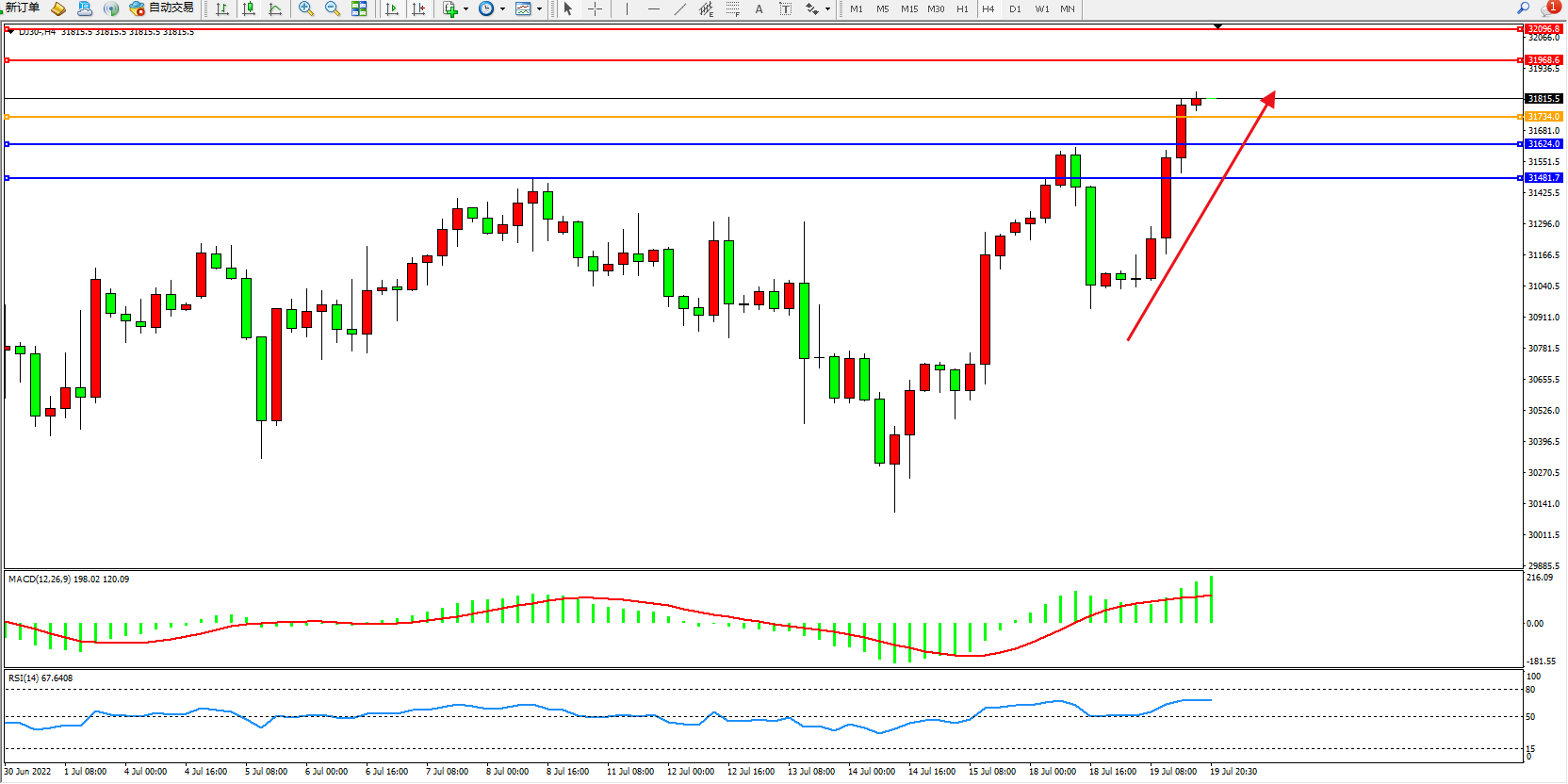 道琼斯指数7月19日(周二)收盘上涨752.10点,涨幅2.42%,报31824.71点;亚特兰大联储GDPNow模型对美国第二季度GDP预测下降至-1.6%。