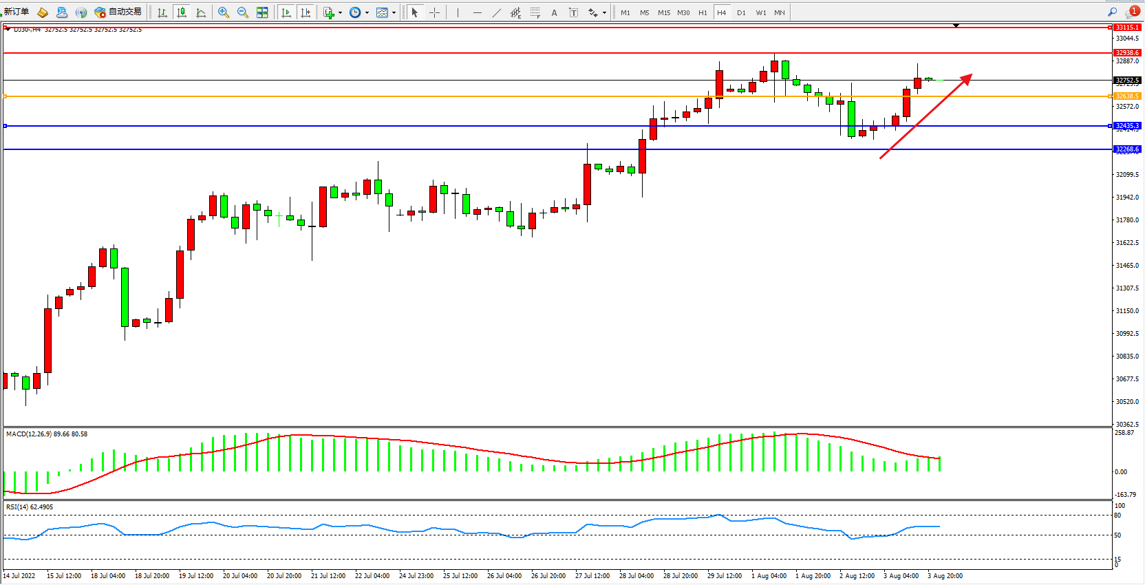 道琼斯指数8月3日(周三)收盘上涨415.83点,涨幅1.28%,报32812.00点;美国服务业7月意外回升,ISM调查显示物价增长放缓,美国服务业7月意外回升,因订单增长强劲,同时供应瓶颈和物价压力缓解,支撑了经济并未陷入衰退的观点(尽管上半年产出下滑)。