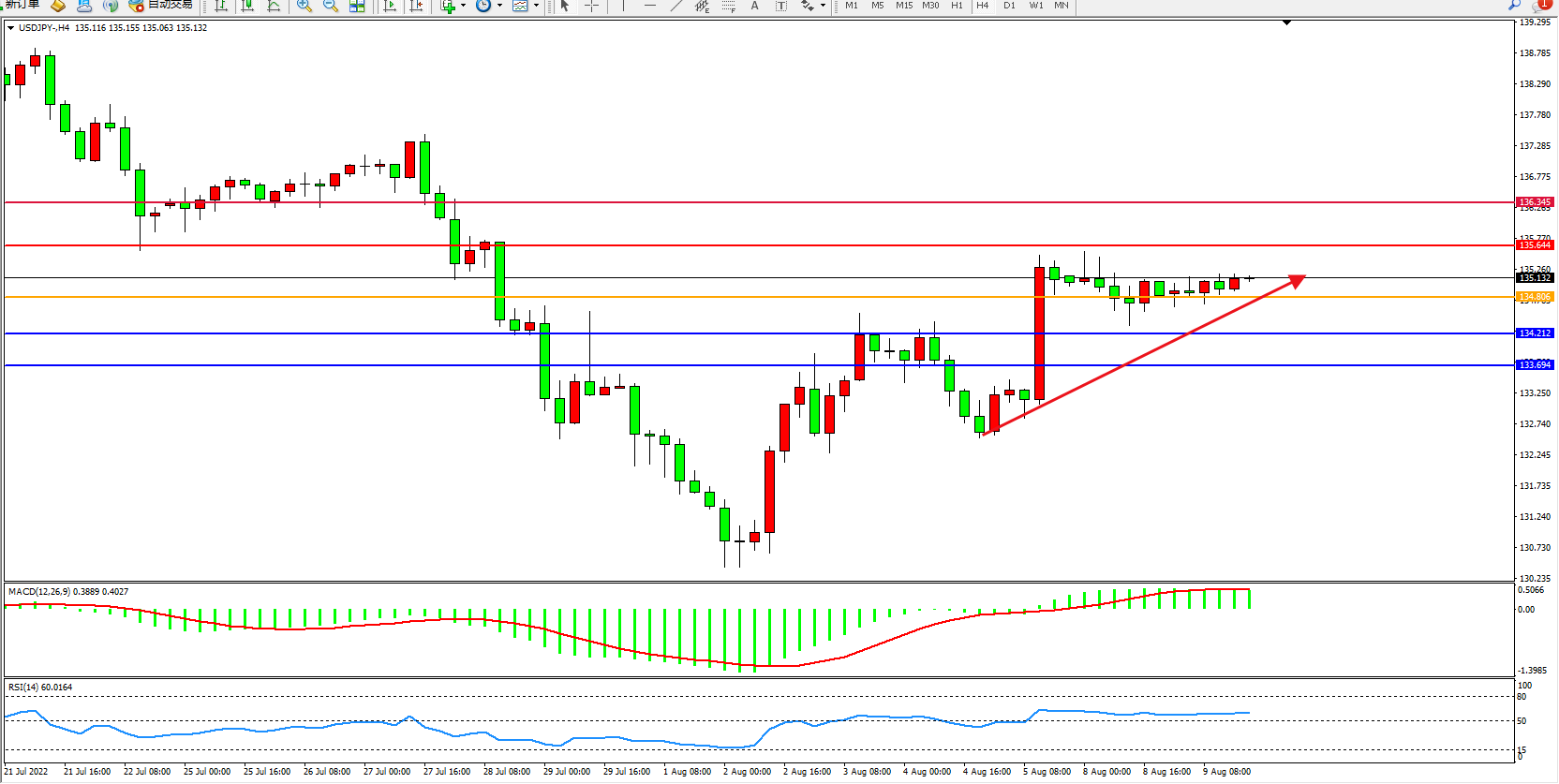 交易策略:134.806上方看涨,目标135.644、136.345